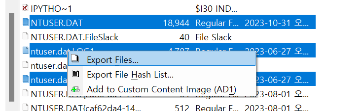 ์ฌ์ฉ์ ๊ณ์ ์ ๋ค์ด๊ฐ์ NTUSER.DAT, ntuser.dat.LOG1, ntuser.dat.LOG2 ํ์ผ์ ์ ํํด์ค๋ค.