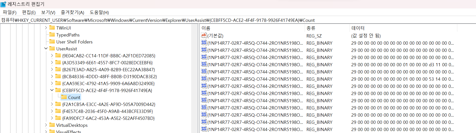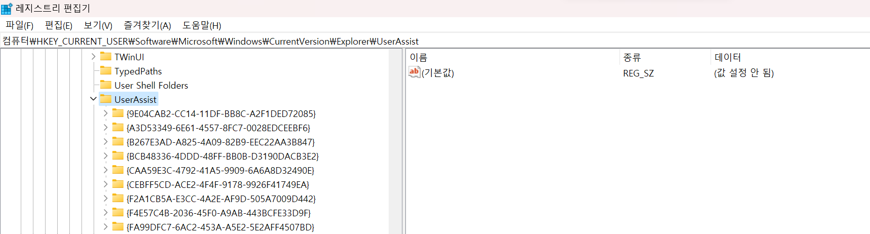 - UserAssist : ์ต๊ทผ์ ์คํํ ํ๋ก๊ทธ๋จ ๋ชฉ๋ก, ๋ง์ง๋ง ์คํ ์๊ฐ, ์คํ ํ์