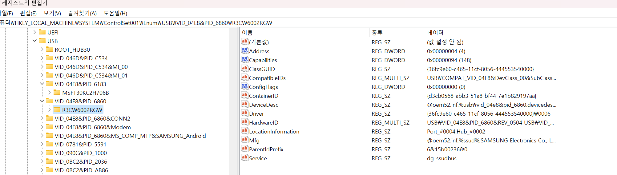 ๋จผ์ HKLM\SYSTEM\ControlSet001\Enum\USB ๊ฒฝ๋ก๋ก ์ ์ํ๋ฉด ์์คํ ์ ์ฐ๊ฒฐ๋์๋ ๋ชจ๋ USB ์ฅ์น์ ์ ๋ณด๋ค์ ํ์ธํ ์ ์๋ค.