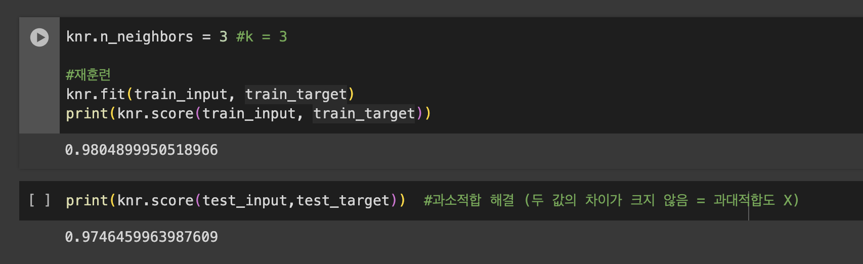 //ํ๋ จ ์ธํธ์ ํ ์คํธ ์ธํธ์ ์ ์๋ฅผ ๋น๊ตํ์์ ๋ ํ๋ จ ์ธํธ๊ฐ ๋๋ฌด ๋์ผ๋ฉด ๊ณผ๋์ ํฉ, ๋ฐ๋๊ฑฐ๋ ์ ์๊ฐ ๋ ๋ค ๋ฎ์ผ๋ฉด ๊ณผ์์ ํฉ์ด๋ค.