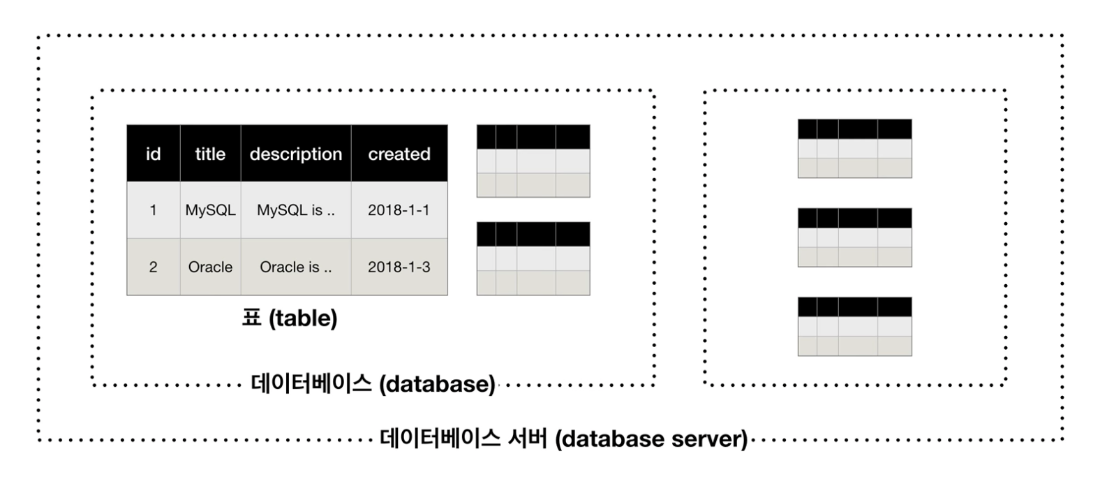 - '๋ฐ์ดํฐ๋ฒ ์ด์ค' == '์คํค๋ง' = ์๋ก ์ฐ๊ด๋ ํ๋ค์ grouping ํ๋ ์ผ์ข ์ ํด๋