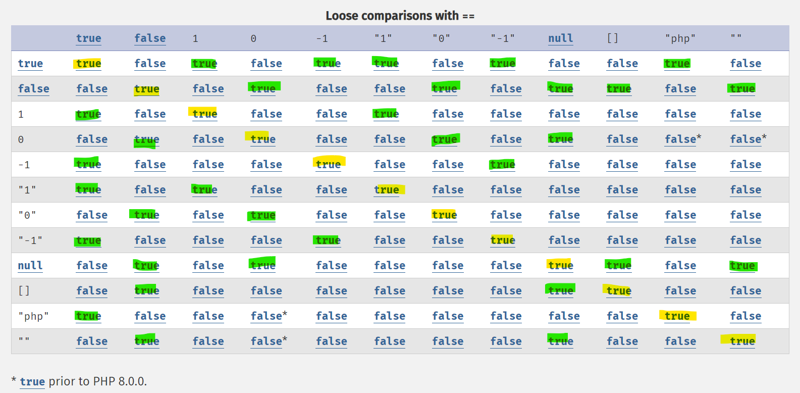 var_dump(0 == 'string'); // true (PHP 8.0 ์ด์ )