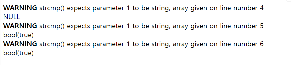 ์ค์ ๋ก var_dump ๋ฅผ ์ด์ฉํด์ strcmp($test, "admin") ์ ๋ฆฌํด๊ฐ์ ๋ณด๋ฉด, test ๋ณ์๊ฐ ๋ฐฐ์ด์ผ ๋ strcmp ๊ฒฐ๊ณผ๊ฐ null๊ฐ์ผ๋ก ์ถ๋ ฅ์ด ๋๋ค.