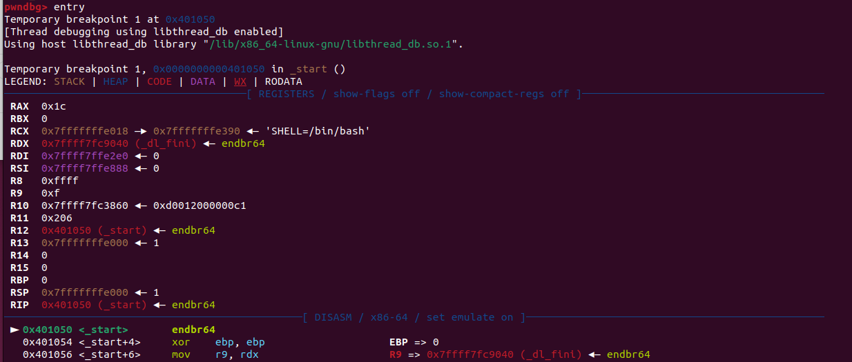 DISASM์์ญ์ ํ์ดํ(โบ)๊ฐ ๊ฐ๋ฆฌํค๋ ์ฃผ์๋ ํ์ฌ rip์ ๊ฐ์ธ๋ฐ, entry ๋ช ๋ น์ด๋ฅผ ์คํํ๊ณ ๋ณด๋ฉด ์ํธ๋ฆฌ ์ฃผ์์ธ 0x401050์ ๊ฐ๋ฆฌํค๊ณ ์๋ค.