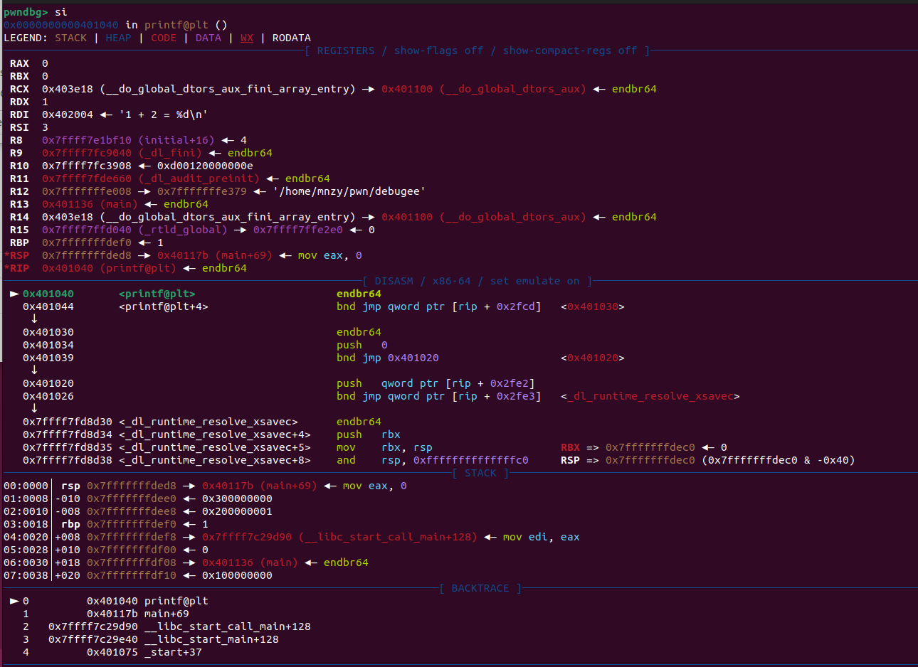 - main ํจ์์์ printf ํจ์๋ฅผ ํธ์ถํ๋ ์ง์ ๊น์ง ์คํ
