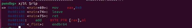 - x/5i $rip : rip๋ถํฐ 5์ค์ ์ด์