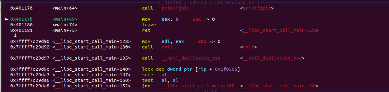 - ni ์คํ ๊ฒฐ๊ณผ: printf()ํจ์๋ก ๋ค์ด๊ฐ์ง ์๊ณ , ๋ฐ๋ก ๊ทธ ๋ค์ ๋ช ๋ น์ด๋ก ๋์ด๊ฐ (printf ํจ์ ๋ฐ๋ก ๋ค์์ผ๋ก rip๊ฐ ์ด๋)