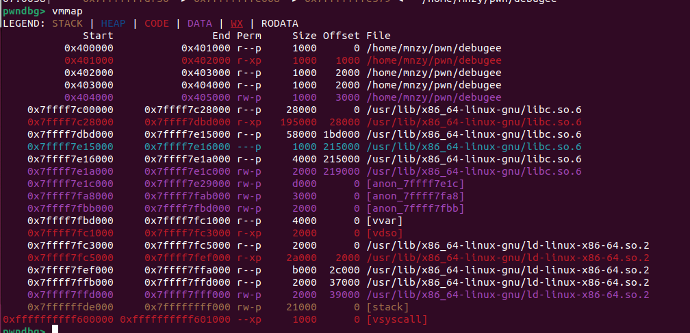 vmmap์ ๊ฐ์ ๋ฉ๋ชจ๋ฆฌ ๋ ์ด์์์ ์๊ฐ์ ์ผ๋ก ๋ณด์ฌ์ฃผ๋ ๋ช ๋ น์ด์ด๋ค.