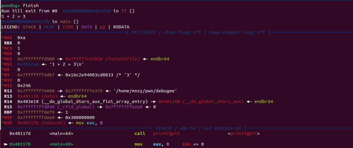 - x/s 0x400000 : ํน์ ์ฃผ์(0x400000)์ ๋ฌธ์์ด ์ถ๋ ฅ
