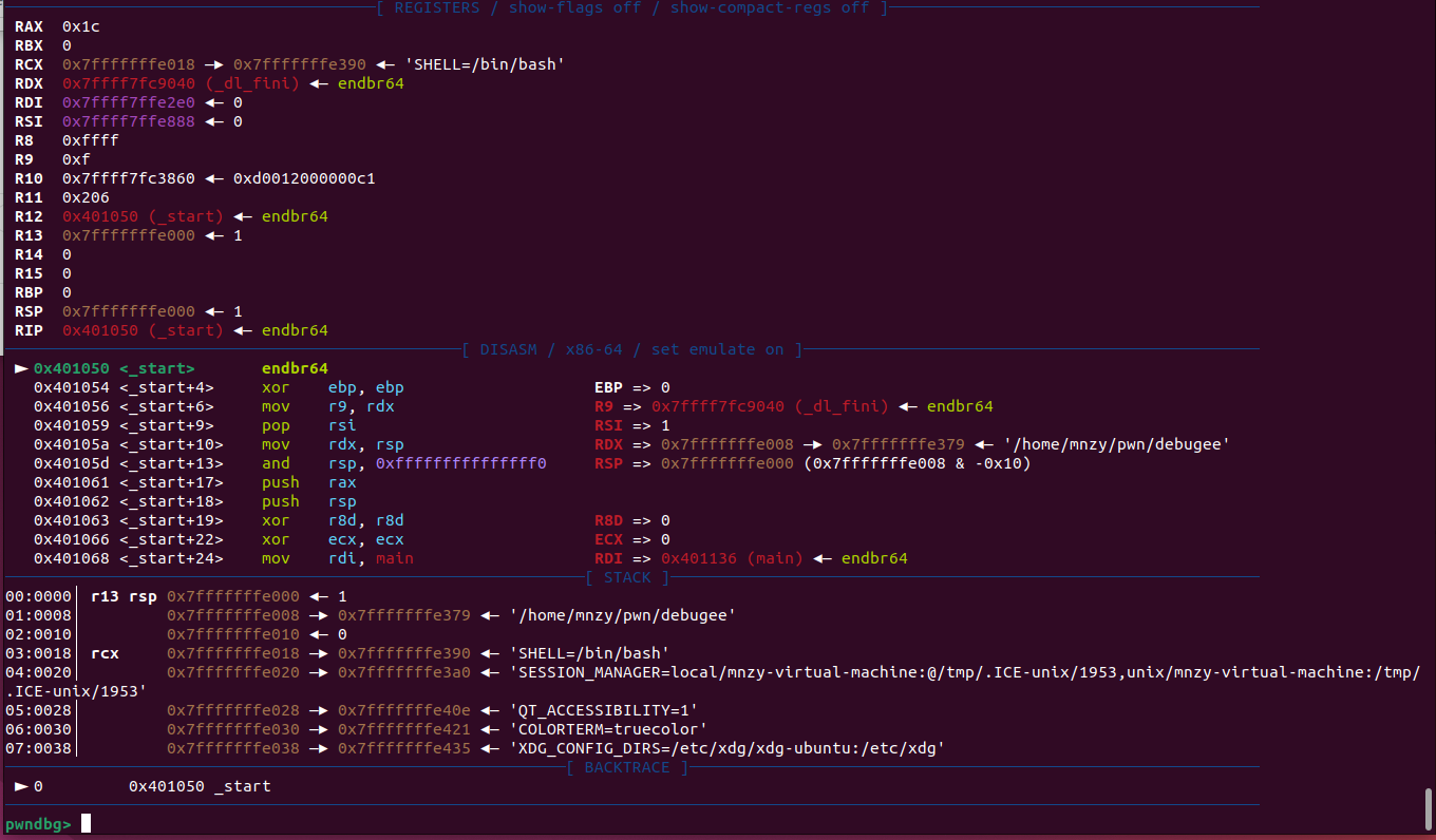 ๋ฐ๋ผ์ ๋๋ฒ๊ฑฐ๋ฅผ ์ด์ฉํ์ฌ ํ๋ก๊ทธ๋จ์ ์คํ ๊ณผ์ ์ ์์ธํ ๊ด์ฐฐํ๋ ค๋ฉด ์ปดํจํฐ์ ๊ฐ์ข ๋ฉ๋ชจ๋ฆฌ๋ฅผ ํ๋์ ํ์ ํ ์ ์๋ ๊ฒ์ด ์ข๋ค. pwndbg๋ ์ฃผ์ ๋ฉ๋ชจ๋ฆฌ๋ค์ ์ํ๋ฅผ ํ๋ก๊ทธ๋จ์ด ์คํ๋๊ณ ์๋ Context๋ฅผ ๊ฐ๋ ์ฑ ์๊ฒ ํํํ ์ ์๋ ์ธํฐํ์ด์ค๋ฅผ ๊ฐ์ถ๊ณ ์๋ค.