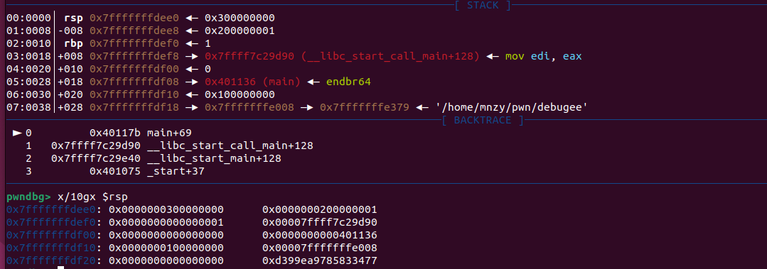 - BACKTRACE: ํ์ฌ rip์ ๋๋ฌํ ๋๊น์ง ์ด๋ค ํจ์๋ค์ด ์ค์ฒฉ๋์ด ํธ์ถ๋๋์ง ๋ณด์ฌ์ค๋ค.