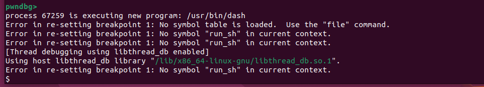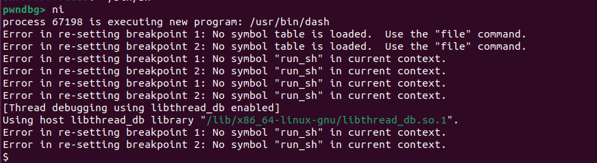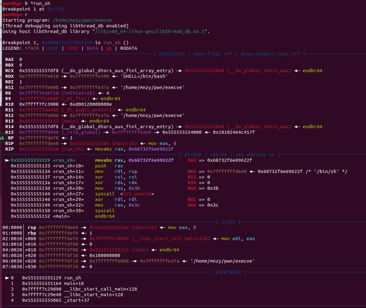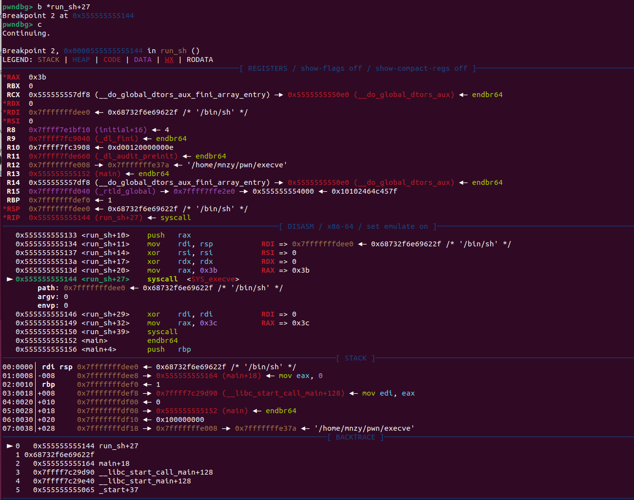 execve syscall ์ด ์คํ๋๊ธฐ ์ง์ ์ธ run_sh+27์ bp๋ฅผ ๊ฑธ์ด์ค ๋ค ์คํํ๋ค.