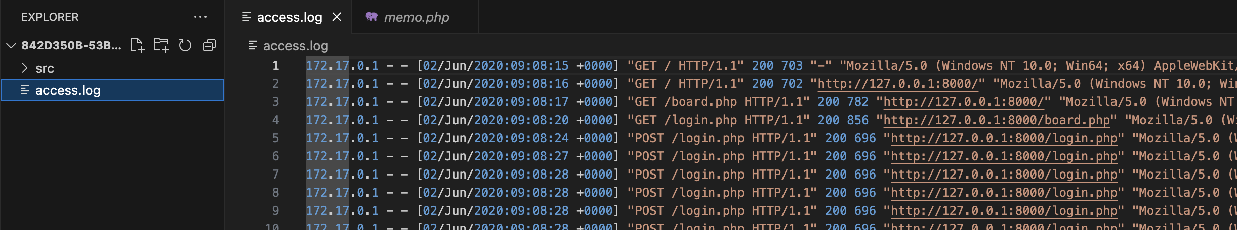 172.17.0.1 - - [02/Jun/2020:09:08:17 +0000] "GET /board.php HTTP/1.1" 200 782 "http://127.0.0.1:8000/" "Mozilla/5.0 (Windows NT 10.0; Win64; x64) AppleWebKit/537.36 (KHTML, like Gecko) Chrome/83.0.4103.61 Safari/537.36"