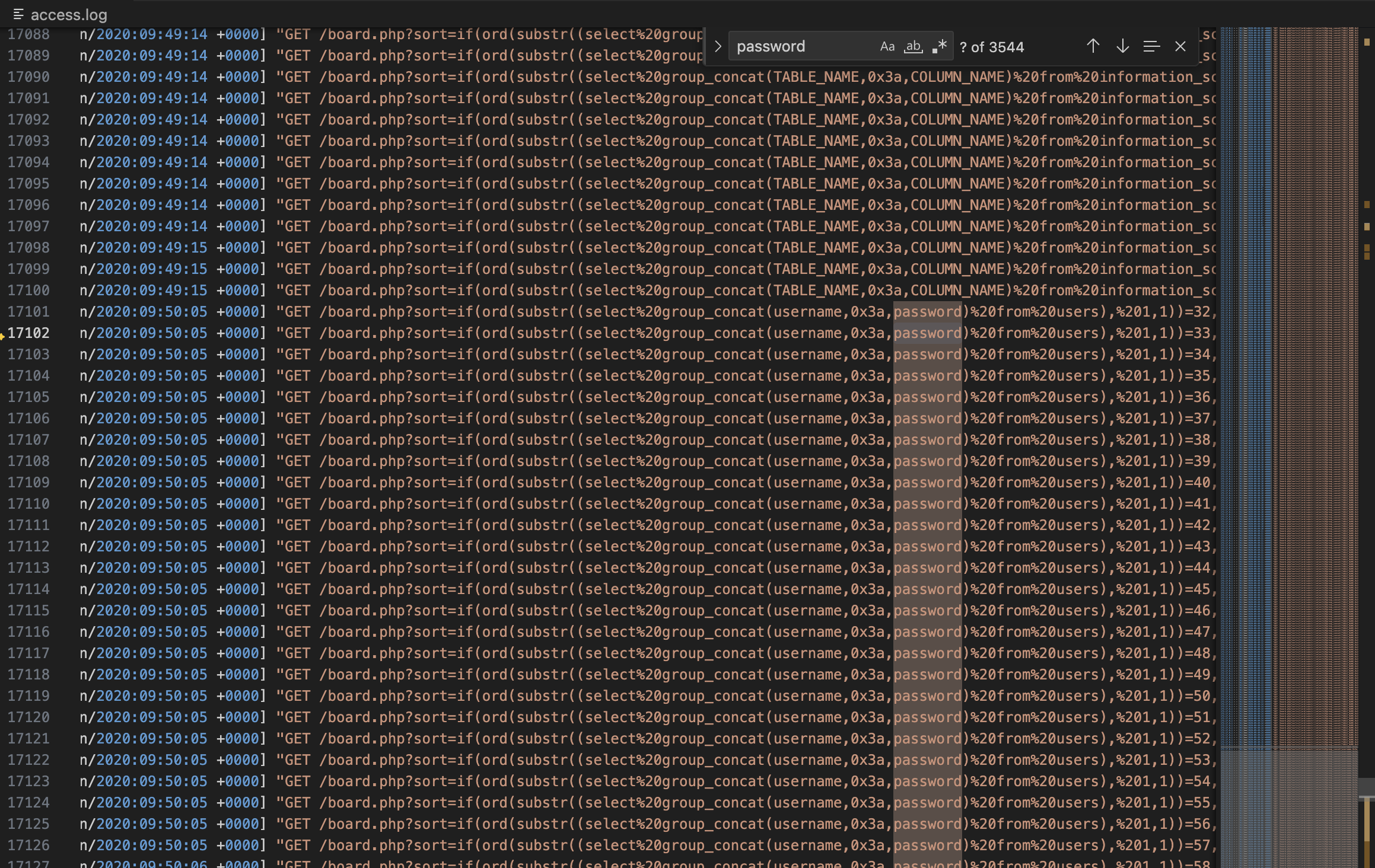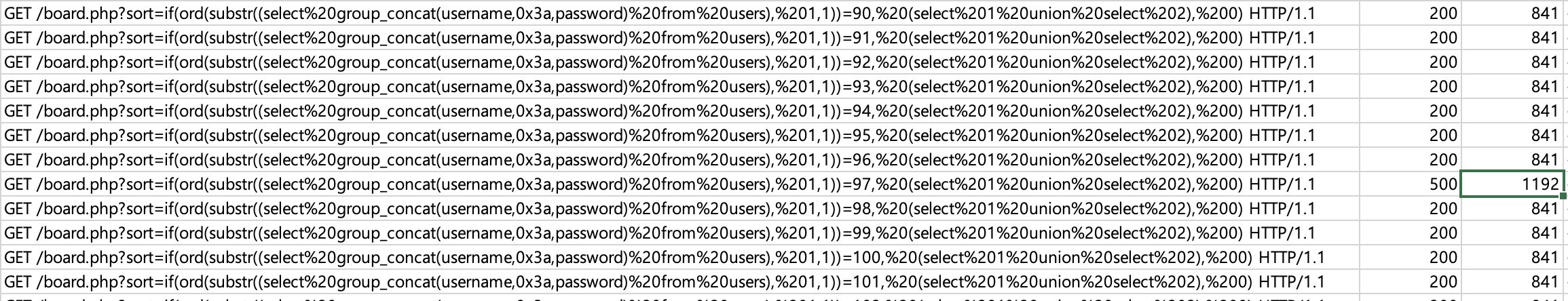 ์ค์ ๋ก ํจ์ค์๋๋ฅผ ์์๋ด๊ธฐ ์ํด /board.php ๊ฒฝ๋ก์์ ord(substr(database(), 1,1)) ์ฟผ๋ฆฌ๋ฅผ ํตํด Blind SQL Injection ์ ์ฌ์ฉํ ๊ฒ์ ์ ์ ์๋ค. ๋ฟ๋ง ์๋๋ผ ํจ์ค์๋์ ๋ํ ๊ณต๊ฒฉ ์ด์ ์ ํ ์ด๋ธ ์ ๋ณด์ ๋ํด ์์๋ด๊ธฐ ์ํด information_schema.columns ๋ฅผ ์ฌ์ฉํ ๊ฒ์ ์์๋ผ ์ ์์๋ค. (ํ ์ด๋ธ๋ช ๊ณผ ์นผ๋ฝ๊ฐ์ ์๊ธฐ ์ํจ)