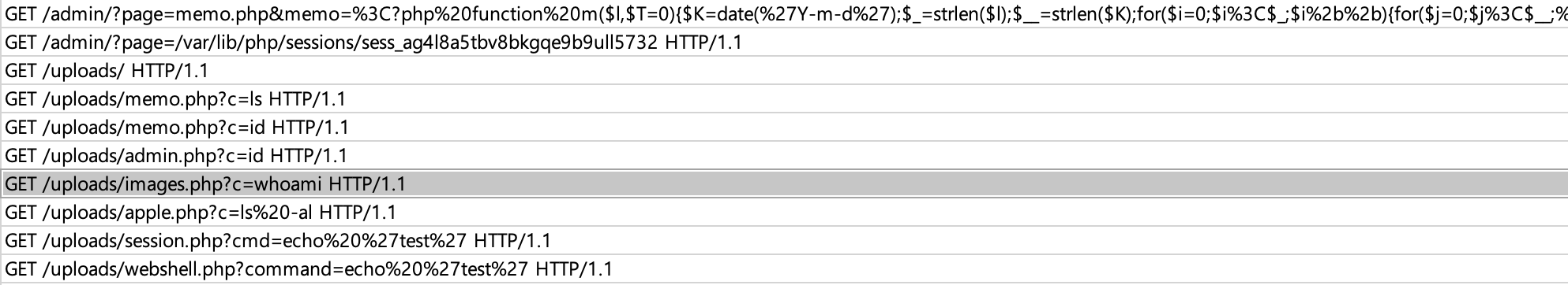 ๋ก๊ทธ ํ์ผ์ ๋ถ์ํด๋ณด๋ฉด ์ ๋ก๋๋ ์น์(images.php)์ ํตํด ์ฒ์ ์คํ๋ ๋ช ๋ น์ด๋ whoami ๋ผ๋ ๊ฒ์ ์ ์ ์๋ค.
