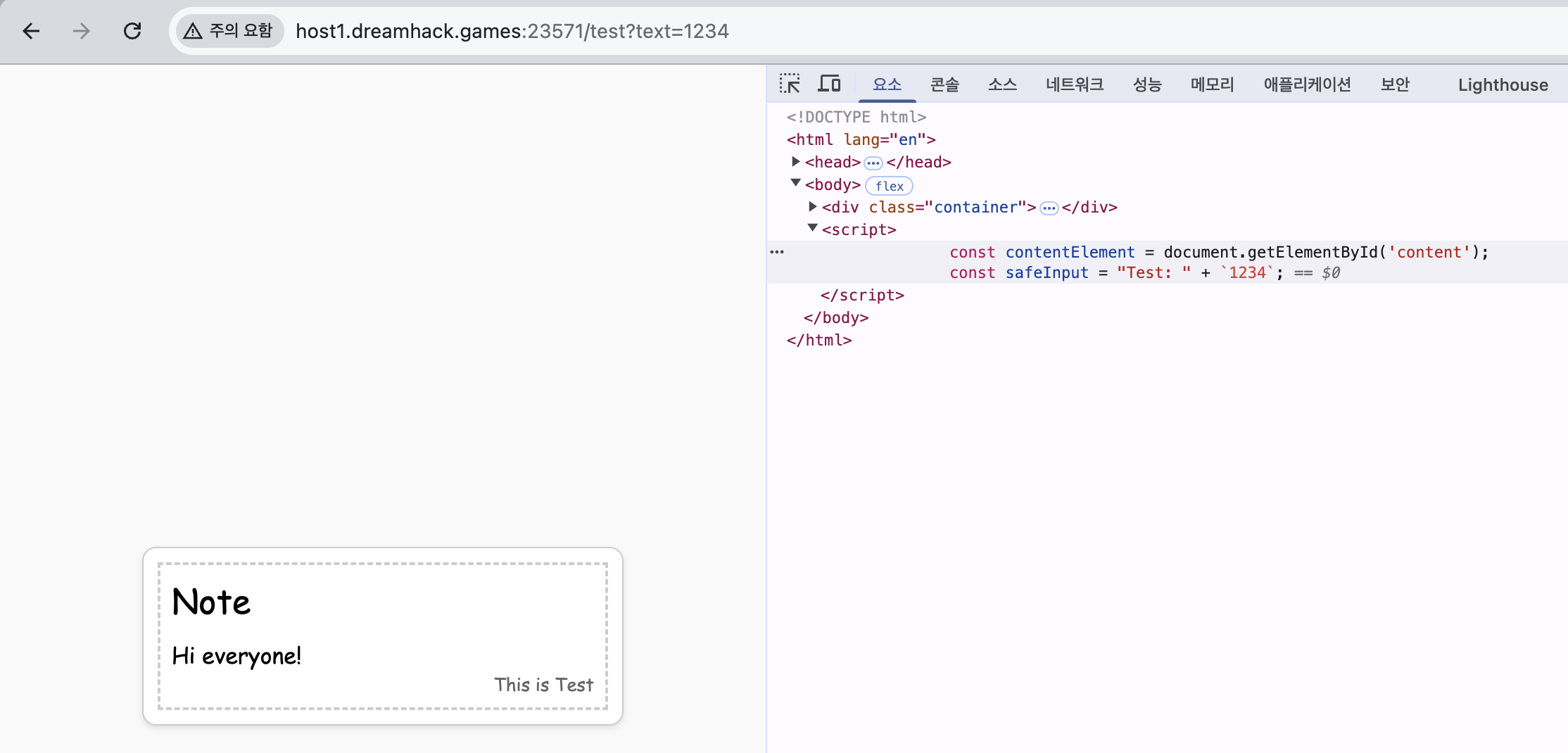 ์ด๋ test.html์ ๋ณด๋ฉด ์ฌ์ฉ์ ์ ๋ ฅ(test)์ด JavaScript ๋ฌธ์์ด์ ์ง์ ์ฝ์ ๋๋ ๊ฒ์ ํ์ธํ ์ ์๋ค.