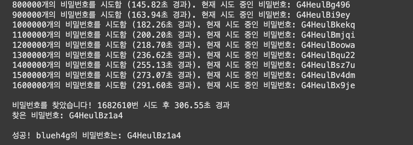 print(f"\n์ฑ๊ณต! {username}์ ๋น๋ฐ๋ฒํธ๋: {found_password}")
