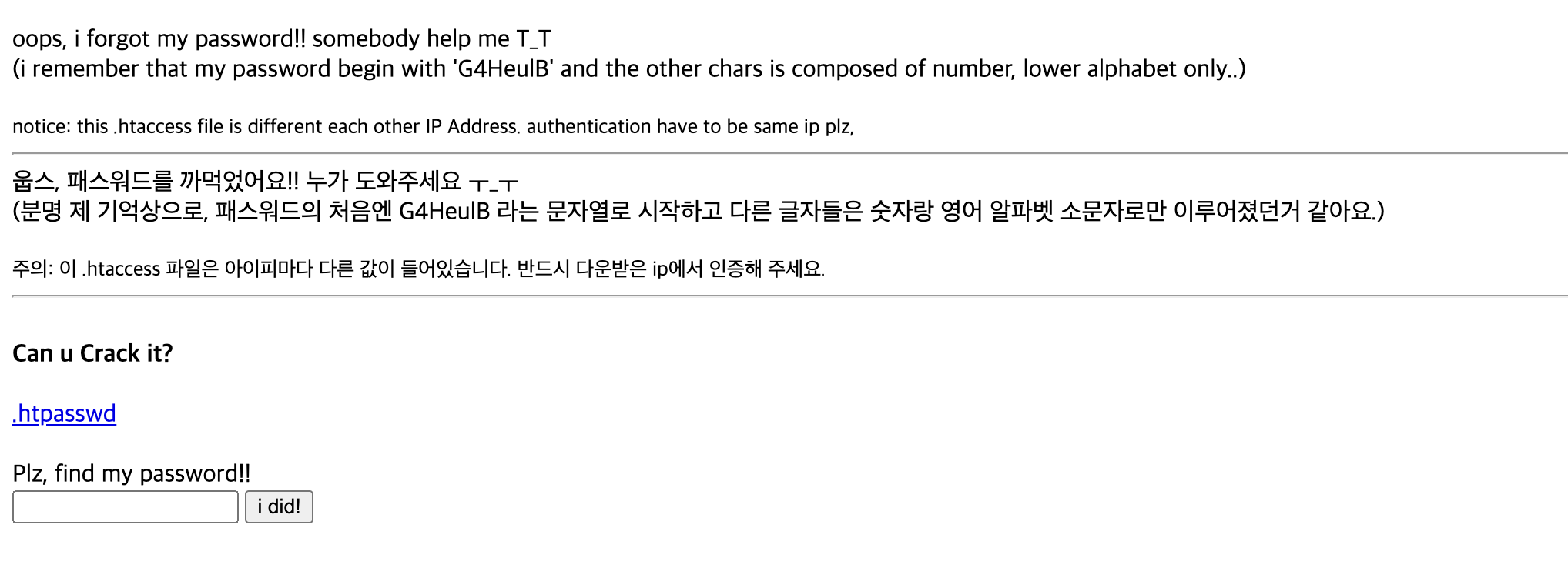 htpasswd ํ์ผ์ ๋ถ์ํด์ Brute Force๋ฅผ ํตํด ํจ์ค์๋๋ฅผ ์์๋ด์ผ ํ๋ ๋ฌธ์ ์ด๋ค.