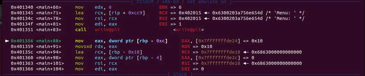 ์ค์ ๋ก ๋๋ฒ๊น ํด๋ณด๋ฉด buf ๋ณ์๋ 0x7fffffffde18( rbp - 0x18 )์ ์์นํ๊ณ , buf_size ๋ 0x7fffffffde24( rbp - 0xc )์ ์์นํ์ฌ 12๋ฐ์ดํธ ๊ฑฐ๋ฆฌ์ ์๋ค๋ ๊ฒ์ ์ ์ ์๋ค. ๋ฐ๋ผ์ buf์ ์ ๋ ฅ ๊ฐ๋ฅํ ํฌ๊ธฐ๋ ์ต๋ 16 ๋ฐ์ดํธ์ด๋ฏ๋ก buf_size ์์ฒด๋ฅผ ์ค๋ฒํ๋ก์ฐ๋ฅผ ํตํด ๋ฎ์ด์จ์ ํฌ๊ธฐ๋ฅผ ๋ณ๊ฒฝํ ์ ์๋ค๋ ๊ฒ์ด๋ค.