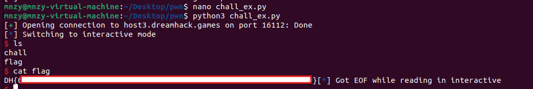 ๋ฐ๋ผ์ ์ฒซ๋ฒ์งธ ์ ๋ ฅ ๋ค์ 26๋ฐ์ดํธ๋ฅผ ์ ๋ ฅํ ๋ค ๋ฆฌํด ์ฃผ์๋ฅผ flag ์ฃผ์๋ก ๋ฎ์ด์ฐ๋ฉด ์์ ํ๋ํ ์ ์์ ๊ฒ์ด๋ค.