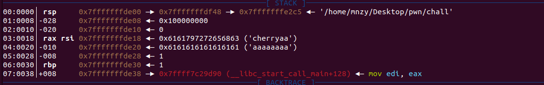 - ์ ๋ ฅ์ด "cherry"์ ๊ฐ๋ค๋ฉด "Is it cherry?: " ๋ฉ์์ง๋ฅผ ์ถ๋ ฅํ ํ, fruit(6๋ฐ์ดํธ ํฌ๊ธฐ)์ ๋ค์ buf_size(16๋ฐ์ดํธ)๋งํผ ์ ๋ ฅ์ ๋ฐ์